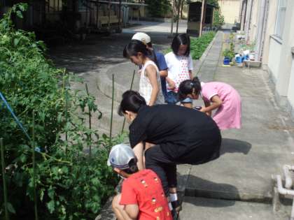 2年生が育てている夏野菜。水やり当番に来た時に新鮮な野菜を順番に持って帰ります。今日はトマト,なすび,シシトウができています。みんなで仲良く分けます。