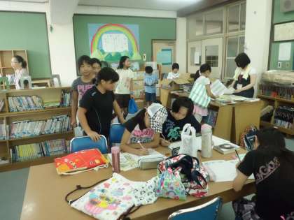 図書ボランティアさんが図書室で読書指導をしてくれています。教室での学習を終えた子どもたちが集まってきています。