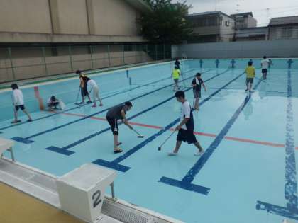 本日,プールの水質が悪化したため,水の全面入替え等を行うため,プールの水を抜きました。そこで,一緒に教職員でプールを清掃しました。今日,明日と楽しみにしていた子どもたちもたくさんいたと思います。急なことで保護者の皆様にもご迷惑をおかけしました。27日(金)よりプールを再開します。楽しみにしていてください。