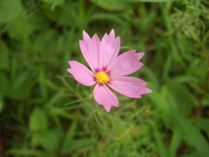 小さなコスモスの花が一輪咲きました。一般的に言われているコスモスはオオハルシャギク(大春車菊)です。