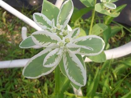 えっ,夏に初雪?と思われるかもしれませんね。名前の由来は初雪が積もったように,上の方の葉ほど白くなっていくからだそうです。写真のように,小さな白い花を夏〜秋に咲かせますが観賞用としては斑入りの葉が多用されています。