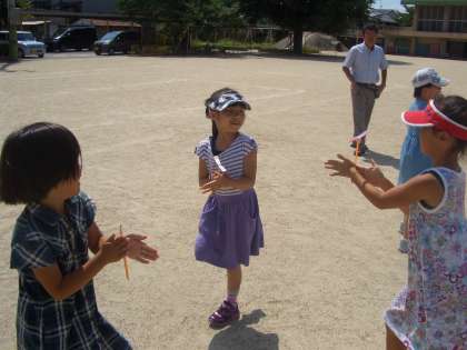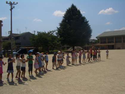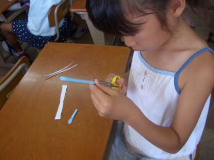 2年生の登校日,みんな元気に夏やすもを過ごしています。今日はみんなでストロートンボを作って,運動場で飛ばして遊びました。