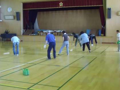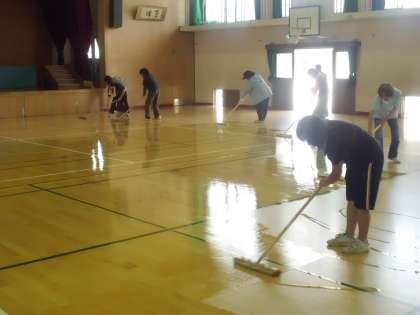 管理用務研究会 北支部の皆さんの共同作業で,体育館のワックスがけをしていただいています。床がみるみる間に美しく輝いてきます。体育館の後は,わくわくルームや家庭科室,新しく作る多目的室(名前を募集中),保健室のワックスがけをしていただきます。暑い中,本当にありがとうございます。
