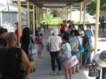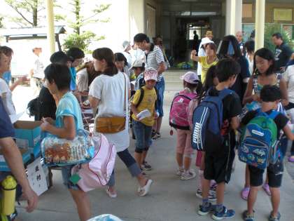 今日と明日の二日間,学校お泊り会が行われます。すごく暑いけど,体調に気をつけて楽しみましょう。受付開始を待ち切れず,早くから子どもたちが集まっています。