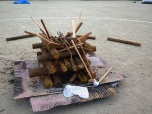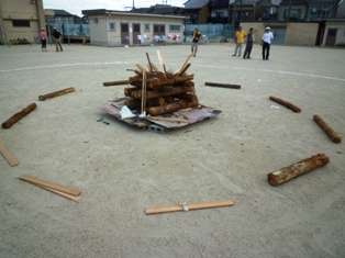 夜のキャンプファイアーの準備ができてきました。花背山の家の先生にきていただき、立派な火床がくみ上げられました。