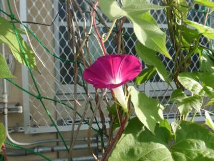 緑のカーテンのアサガオが花を咲かせました。連日の猛暑のせいか,成長も花咲きも遅いようです。