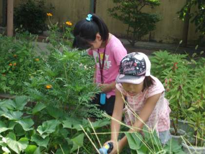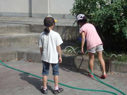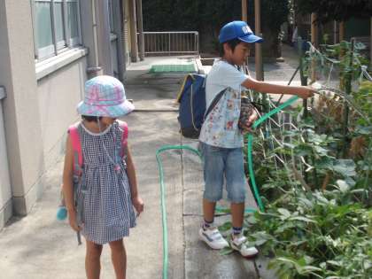 今日も水やり当番さんが頑張っています。暑い中,自分たちが育てている夏野菜やサツマイモを枯らさないように,しっかり水やりをしています。今日も新鮮な夏野菜をゲットです。
