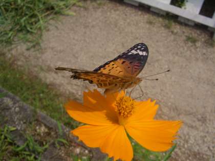ツマグロヒョウモンが黄花コスモスの蜜を吸いに来ています。
