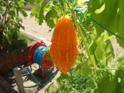 4年生が育てているツルレイシ。やっと実がたくさんなってきました。一番早く実をつけたツルレイシがオレンジ色に熟しています。