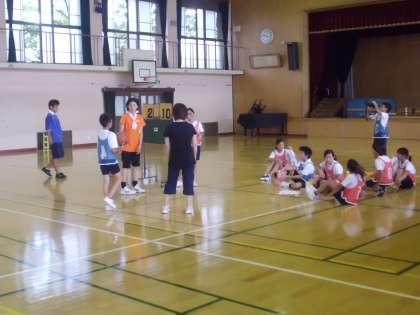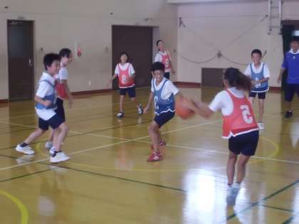 部活動 バスケットボール部が頑張って練習しています。地域(保護者)の指導者の方にご協力いただいて,暑い中練習しています。