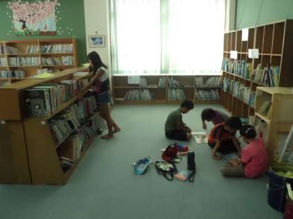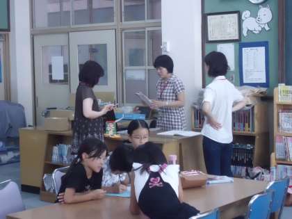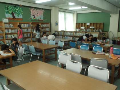今日がサマースクール 読書指導の最終日です。ラジオ体操帰りの図書室で本を読んでいます。この夏休み,13日間も図書室を開館していただきました。図書ボランティアの皆さん,本当にありがとうございました。
