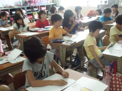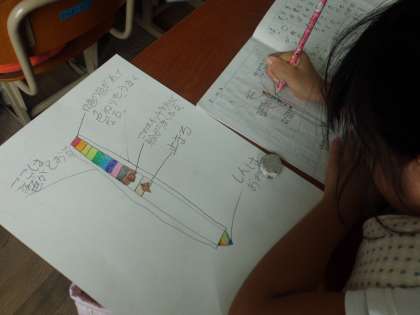 ドラえもんになったつもりで「あったらいいなこんなもの」を考えています。一番お気に入りの「あったらいいな」と思うものを選び,選んだものについて絵に表わし,説明を書き加えています。