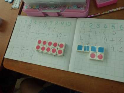 10のまとまりに着目して,数図ブロックの操作活動を通して,簡単な(2位数)+(1位数)の計算をする計算をしています。
