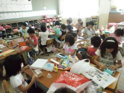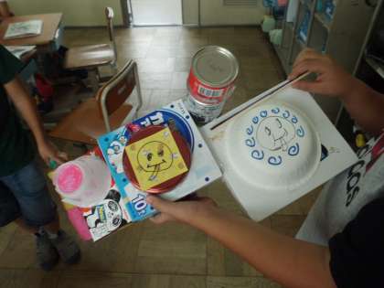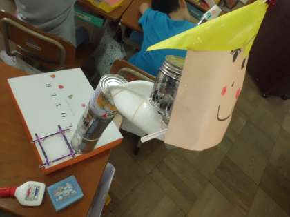 いろいろなものを使って,工夫して楽しい楽器を作っています。さて,どんな音が出るかな?