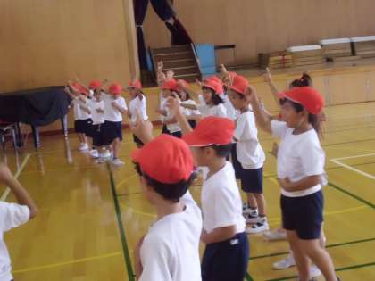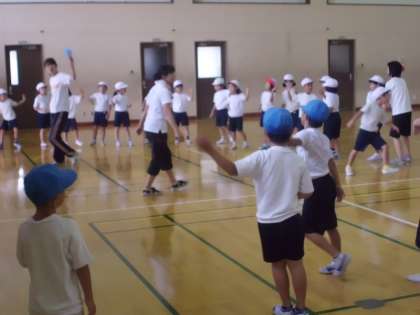体育館で運動会の演技の練習中です。みんな楽しそうに踊っています。さて,運動場ではどんな形で踊るのかな?