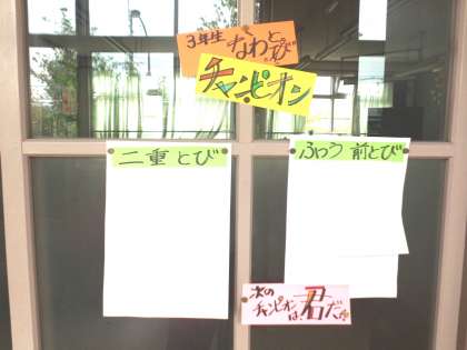 3年生の教室の窓に「なわとび チャンピオン」の掲示があります。どうやら,運動会の個人走で縄跳びがあるようで,みんなで競って上手に飛べるように練習してるようです。毎日回数がふえて,チャンピオンが代わっています。目標を持って取り組むことで成果も上がってきますね。