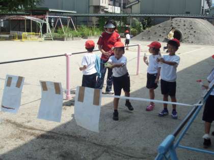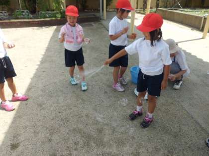夏ももうすぐ終わりに近づいてきています。プールがなくなっても,夏のあそびはいっぱいあります。シャボン玉や的あてなど,水を使っていろいろな遊びをしています。
