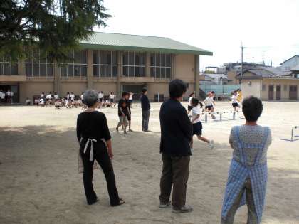 すこやか学級のみなさんが6年生の組体操を見た後,運動場にでると4年生がハードル走の練習をしていました。みなさん足をとめて,4年生のハードル走に見入っていました。