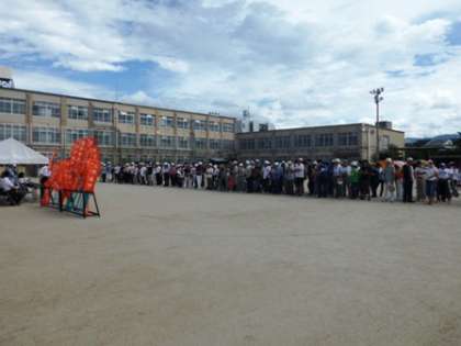 この季節としては、非常に蒸し暑さを感じる中、各町内から200名近くの方々が訓練に参加されました。開会式に続いて、3箇所に分かれて訓練が始まりました。