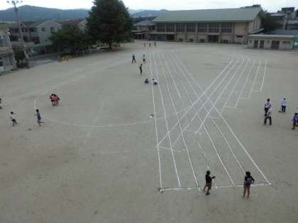 運動会に向けて,練習も熱が入ってきています。そろそろ実際の場面での練習も始ります。そこで,本番同様にラインを引きました。雨が降らなければいいのですが…。