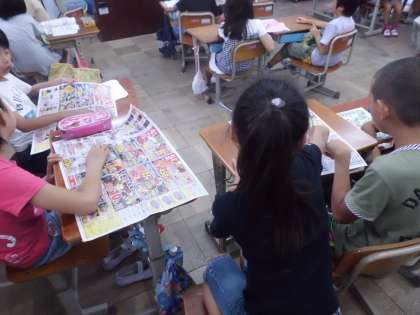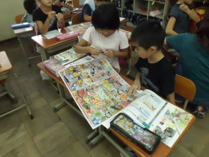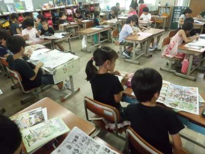 おうちの人が1週間の間どこで何を買っているのか調べてみると,スーパーマーケットや大型専門店で買い物をしている人が多いようです。そこで,ちらしをもとにして,スーパーマーケットで買い物をする人が多いのはなぜなのか予想して話し合っています。
