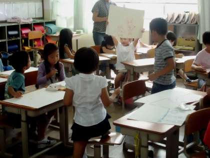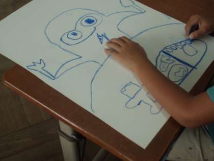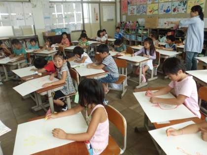 お話の絵を描いています。お話は「こぶたしょくどう」,どんな話なのかな?話の中身が想像できるように絵に表わします。