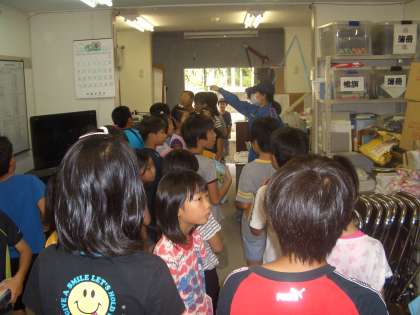 お話を聞いた後,続いて,いろいろな器具や道具が入っている消防分団の倉庫の中を見せてもらいました。