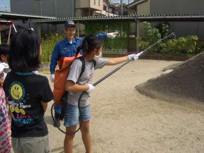 最後に簡易型の放水道具を使った放水訓練を体験させてもらいました。