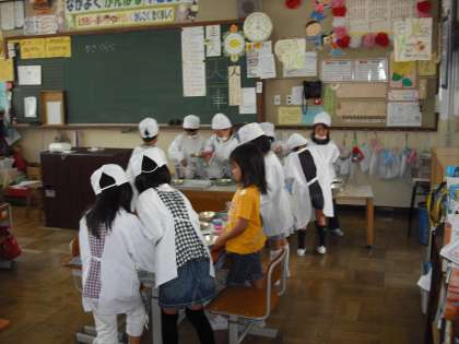 今日の給食のメニューは,さけとだいこん葉のまぜごはん・五目煮豆・豚汁・牛乳です。今日も残さず,おいしく食べましょう。