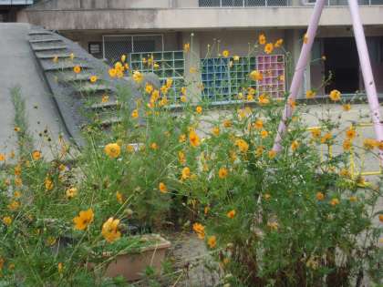 花壇のまわりがキバナコスモスでいっぱいになっています。すべて,こぼれ種から花を咲かせました。