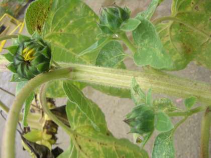 ヒマワリの季節は終わったはずですが…。でも,まだヒマワリが咲いています。そう,わき芽にできたヒマワリのつぼみが花を咲かせています。まだつぼみもたくさんあります。これからも花を咲かせそうです。