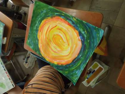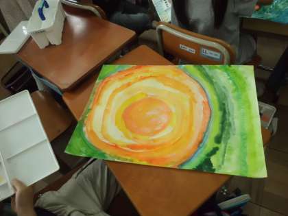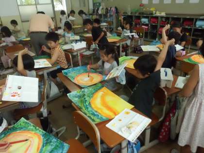 2年生もお話の絵に取り組んでいます。各学級ともお話が違うようです。この学級では丸いお月さんが上手に描かれています。さて,どんな絵に仕上がるのでしょう。
