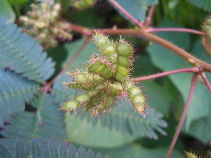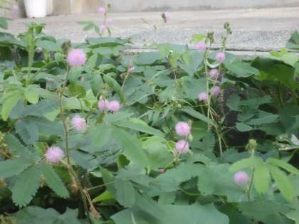 オジギソウが伸びて花をいっぱいつけています(写真ではわかりにくいかもしれませんね)。花の後の種もたくさんできています。