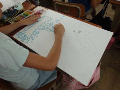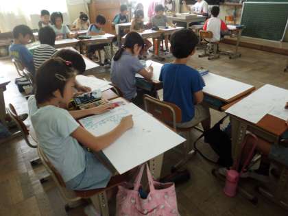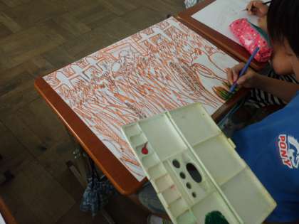 4年生もお話の絵に取り組んでいます。お話の中身が想像できるように工夫して書いています。