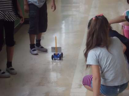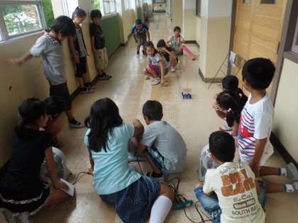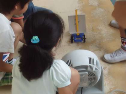 風の力で車が動くことは学習しました。今日は,風の力は同じで風をうける部分の形や大きさによって,車の動き方がかわるか調べています。