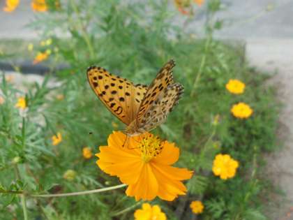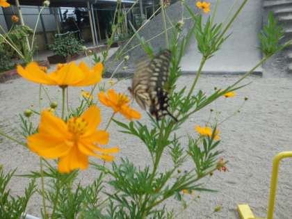 キバナコスモスが満開状態です。その中にじっと立っていると,たくさんのヒョウモンチョウやアゲハチョウが蜜を吸いに来ています。昨日紹介した,ホウジャクも来ています。