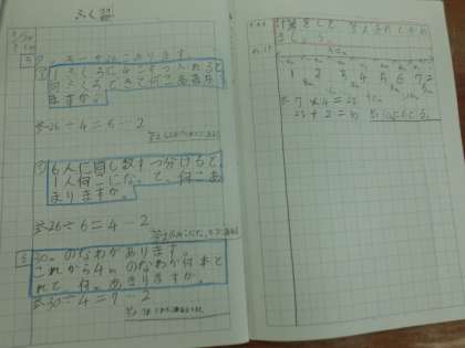 余りのある除法の計算ができるようになりました。そこで,今日は乗法を用いて答えの確かめをすることができるようにしています。