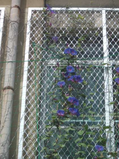 緑のカーテンのオーシャンブルーが,まだきれいに咲いています。