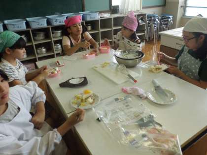 今日の料理クラブは実習です。ケーキに挑戦,生クリーム,フルーツ,チョコレートなどを使って仕上げます。そばにアイスクリームも登場です。