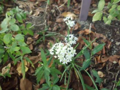 夏には葉の間から30〜40Cmほどの花茎を伸ばします。花期は8〜10月頃。花は半球形の散形花序で白い小さな花を20〜40個もつけます。花弁は3ですが,苞が3枚あり,花弁が6枚あるように見えます。