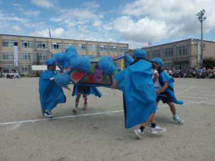 野菜で飾り付けたおみこしをみんなで協力して運びます。落とさないように!