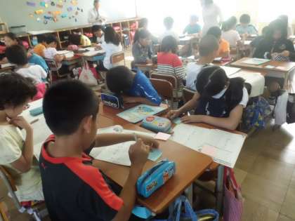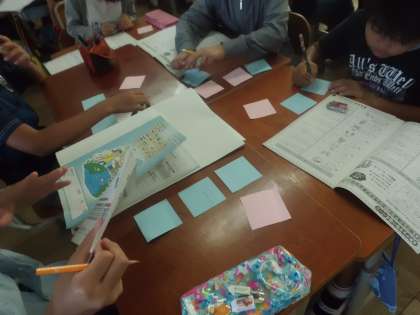 青い紙にできたこと,簡単だったことを,また,ピンクの紙にできなかったこと,難しかったことを書き込んでいます。
