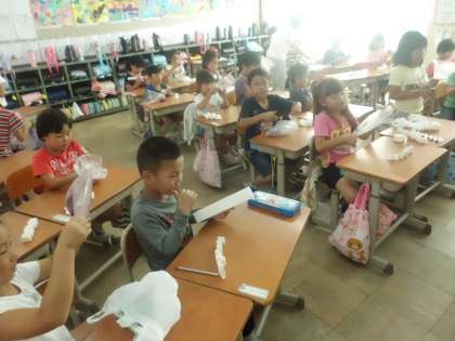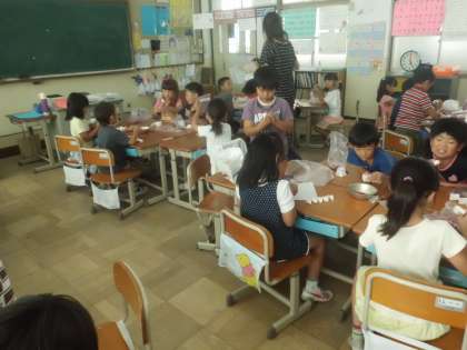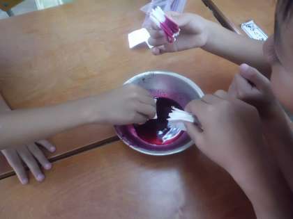 自分たちが育てたあさがおの花や,学校にいっぱい咲いているキバナコスモスをつかって色水を作り,和紙に染めていきます。さて,どんな模様ができるかな?
