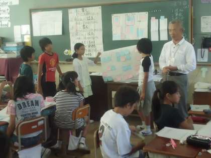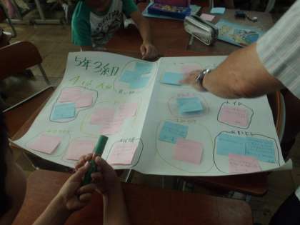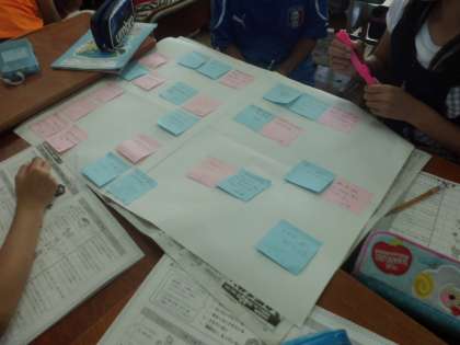 青とピンクの紙に書き込んだものを,グループで似ているものを集め,模造紙に張って,グループでこれから取り組んでいけること,取り組まないといけないことを話し合い発表しています。1人1人が環境についてしっかり考え行動すれば,美しく豊かな自然の地球は守られることでしょう。