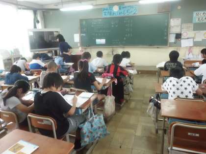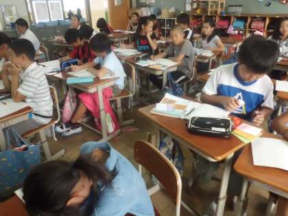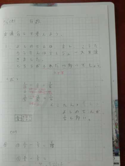 通分を利用いて,異分母分数の減法の計算を学習しています。みんな,しっかりと考えています。