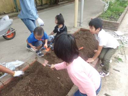 仲よし学級のお友だちが仲よし菜園を耕しています。夏にはいっぱいのキュウリとナスビが採れました。今度は何を植えるのでしょう?