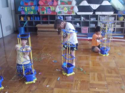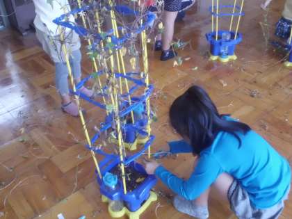 自分たちが育てていたあさがおのつるを使ってリースを作ります。支柱にからまったつるをていねいに取り外し,丸めていきます。出来上がったリースはしばらく乾燥させて,かざりをつけていきます。どんなリースができるか楽しみだね。