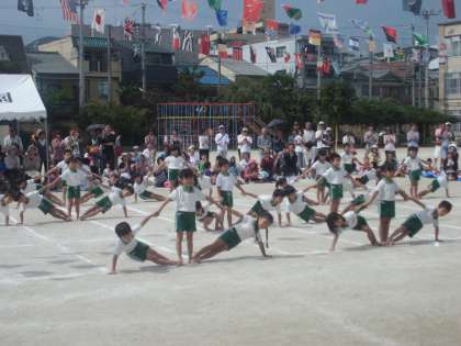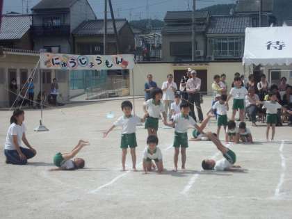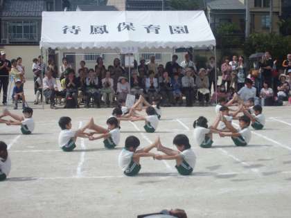 小学校の運動会といえば,6年生の組体操ですが,待鳳保育園の年長さんも組立体操です。一人一人が自分の力を出し切って頑張っています。