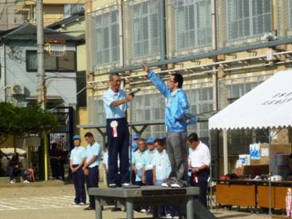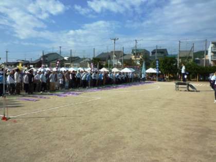 素晴らしい秋晴れの下,第61回待鳳学区民大運動会が,柳沼大会副会長の開会宣言でスタートしました。みなさん,怪我のないように気をつけて,楽しい1日をお過ごしください。