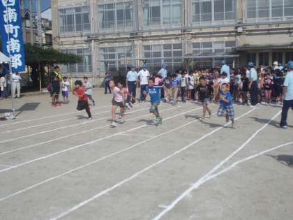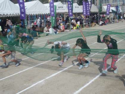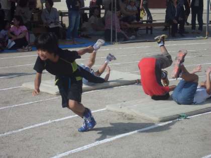 ネット,マット,跳び箱,平均台を通ってゴールです。大逆転も生まれています。